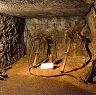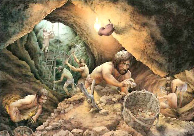 Fig. 6 | Ricostruzione dell'attività estrattiva all'interno di una miniera etrusca. Illustrazione Inklink, Firenze - Foto da: A. Semplici, Bianca e sfolgorante appare la Rocca. Guida al parco archeominerario di San Silvestro, Ed. Parchi Val di Cornia, Gennaio 2011