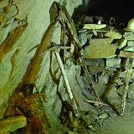 Fig. 4 | Ipotesi ricostruttiva delle attività nella miniera medievale di Manienti. Illustrazione Inklink, Firenze - Foto da: A. Semplici, Bianca e sfolgorante appare la Rocca. Guida al parco archeominerario di San Silvestro, Ed. Parchi Val di Cornia, Gennaio 2011