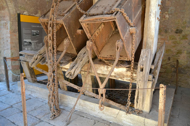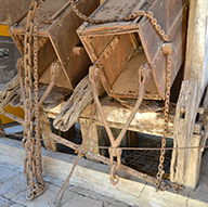 Il trasporto del minerale dai livelli di produzione alla superficie del suolo prende il nome di estrazione (Fig. 6); essa si compie attraverso pozzi verticali o inclinati, percorsi da appositi contenitori sospesi a funi, nei quali vengono disposti i carichi da trasportare. I pozzi, oltre a servire per l’estrazione del minerale, sono utilizzati anche per il trasporto del personale e di materiali vari.